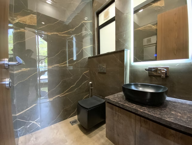 The villa features five bedrooms, a large living–dining area, a formal drawing room, a main kitchen with pantry, a gym space, and a dedicated pooja room. The entrance opens into a double-height foyer with a modern MS staircase, creating an impressive and welcoming entry experience. Flexstone cladding on the staircase wall, highlighted with subtle lighting, adds a refined architectural feature to the interior.