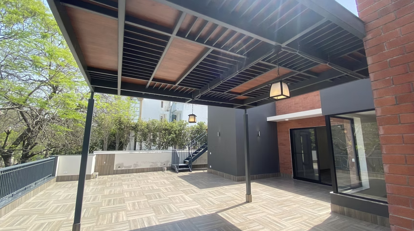 The first floor includes three bedrooms and a pantry, along with a family living space that connects to a half-terrace with a pergola and seating area. The exterior design highlights exposed brick textures complemented by grey finishes, while large windows ensure abundant natural light throughout the home.